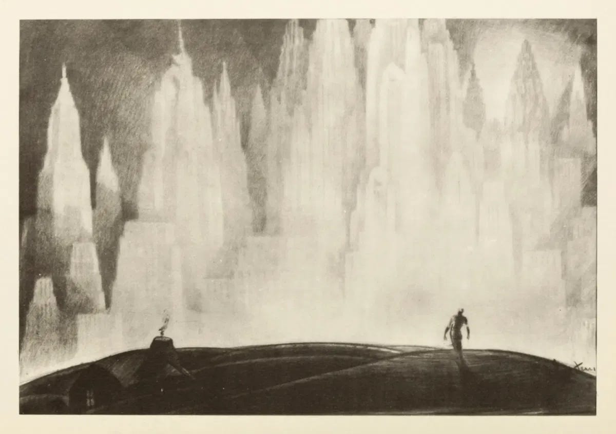 Dan O’Bannon and Mœbius’s The Long Tomorrow, Akira, and Hugh Ferriss’s ziggurat skyscrapers (see the Public Domain Review essay on Ferriss here)